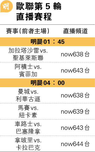 明晨其他歐聯賽事方面,目前在積分榜4戰得10分兼未嘗一敗(3勝1和)的英超勁旅曼城,將主場迎戰易帥後戰績明顯有改善、各賽事已錄三連勝的德甲代表「藥廠」利華古遜。比曼城少1分的另一英超球隊紐卡素,則要作客惡鬥今季在法甲表現出色的馬賽。至於4戰僅得4分、出線資格未許樂觀的意甲班霸拿玻里,則在主場面對偶有佳作的阿塞拜疆球隊卡拉巴克。