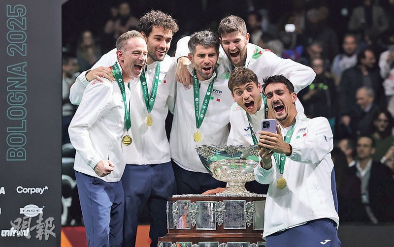 【明報專訊】世界排名第一的意大利隊昨於台維斯盃網球賽總決賽組決賽,雖有兩大名將史拿及梅薩迪同告因傷缺陣,仍以場數2:0擊敗同有世界一哥卡路士艾卡拉斯傷缺的西班牙隊,隊史首度三連霸,亦是繼1972年的美國隊以來,再有球隊至少連贏三屆。
