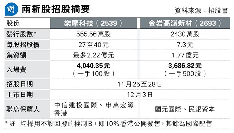 【明報專訊】再有新股接力上市,兩隻小型新股、內地機器按摩服務提供商樂摩科技(2539)及煤系高嶺土公司金岩高嶺新材(2693)昨日起至本周五(28日)招股,兩家公司均採用不設回撥的機制B,合共集資約4億元,預期12月3日上市(見表)。