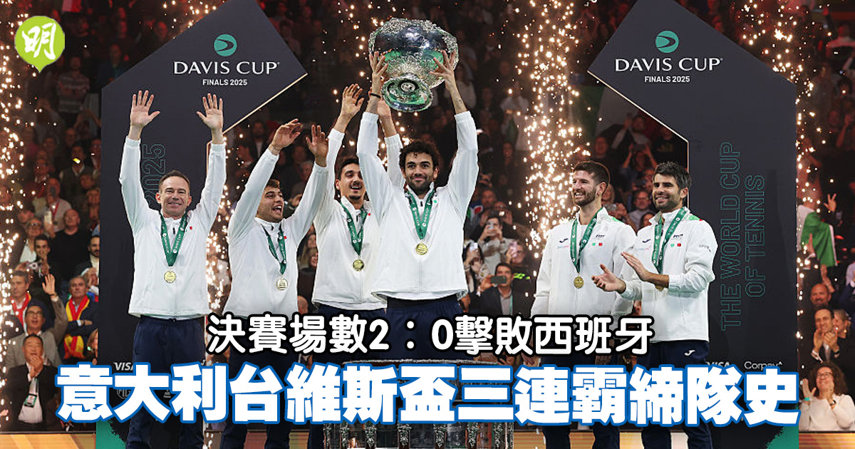 世界排名第一的意大利隊今晨(24日)於台維斯盃網球賽總決賽組決賽,雖有兩大名將史拿及梅薩迪同告因傷缺陣,仍以場數2:0擊敗同有世界一哥卡路士艾卡拉斯傷缺的西班牙隊,隊史首度三連霸,亦是繼1972年的美國隊以來,再有球隊至少連贏三屆。