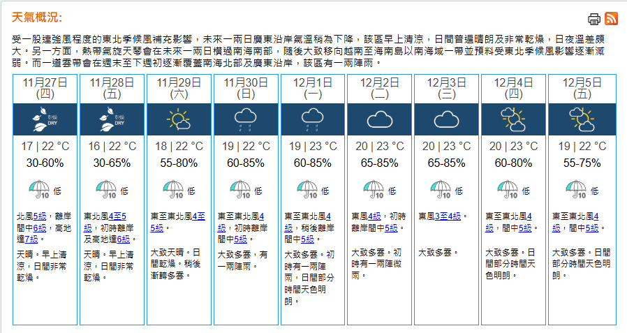 即時熱點 天氣|天文台:周四天晴非常乾燥 市區最低17°C (21:11) 發佈於 2 天 前 2025 年 11 月 26 日 By 明報 天文台表示,本港周四(27日)天晴,早上清涼,市區最低氣溫約17°C,新界再低幾度。日間非常乾燥,最高氣溫約22°C。吹輕微至和緩東北風,晚間北風增強。 展望周五(28日)持續天晴及非常乾燥,初時風勢頗大,早上市區氣溫下降至15至16°C左右,新界再低幾度。周六(29日)稍後漸轉多雲,隨後一兩日有一兩陣雨。 相關文章:天文台天氣天氣速遞編輯推介 Up Next 大埔宏福苑奪命火 民間自發報平安 多個機構提供物資支援【持續更新】 (16:21) 不要錯過 天氣|天文台:周三天晴非常乾燥 早上清涼市區最低17°C (20:58) 繼續閱讀 贊助商 猜你喜歡 天氣|天文台:非常乾燥最高23°C 明早市區降至約15°C (08:24) 天氣|天文台:本港今早較昨日低兩至三度 日間非常乾燥 (08:23) 天氣|天文台:周三天晴非常乾燥 早上清涼市區最低17°C (20:58) 天氣|天文台:最高25°C 本周持續天晴乾燥 (08:20) 天氣|天文台:大致天晴 最高27°C (08:15) 天氣|天文台:周二天晴非常乾燥 早晚最低19°C (20:54)