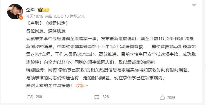 【更新22:26】內地藝人仝卓11月26日晚上更新表弟李怡亨被誘騙至柬埔寨一事最新消息,稱經過中國駐柬埔寨的領事館人員跨國營救,李怡亨已安全抵達領事館,成功脫離險境。感謝大家的關注與援助。