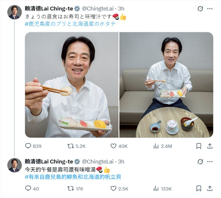 國台辦今早(26日)舉行例行新聞發布會,發言人彭慶恩回應台灣領導人賴清德曬吃日本料理照片撐日本首相高市早苗,指斥賴清德吃的是媚日的飯,幹的是賣台的勾當,其言其行令人作嘔,讓世人再度看清其數典忘祖、背叛民族的醜惡嘴臉。