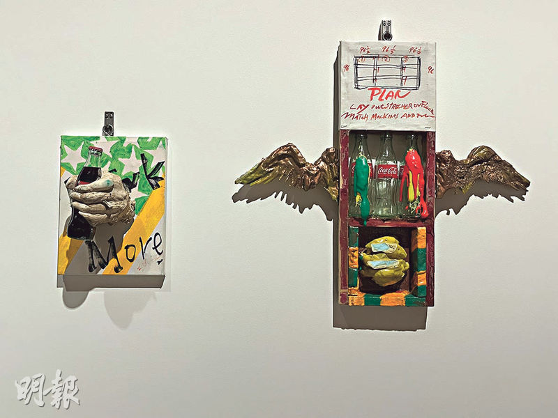 談論藝術與文化交流之類的宏大議題前,不如先聽一個關於勞森伯格的有趣故事。1960年代,美國文化大量傳入日本,雜誌鋪天蓋地,全是美國商品與藝術。勞森伯格於1958年利用空可樂樽創作的組合作品《可口可樂計劃》(Coca-Cola Plan),也傳入日本藝術家篠原有司男眼中。篠原有司男同樣用空可樂樽,創作了自己的作品《多喝點》。1964年,為摩斯.康寧漢舞蹈團(Merce Cunningham Dance Company)擔任服裝設計的勞森伯格隨舞蹈團巡演首次踏足日本,在東京舉行行為展演《向勞森伯格提出的二十個問題》。篠原有司男帶着自己的模仿作品上台與勞森伯格分享,「起初,勞森伯格見到後覺得好開心,鼓勵對方繼續創作……但對方真的繼續做,勞森伯格又覺得有些不開心,覺得對方是不是在嘲笑他」,策展助理賴文杰說。《可口可樂計劃》與《多喝點》正並排陳列在展廳一側,是模仿、致敬還是嘲笑,觀眾不妨自己探索。