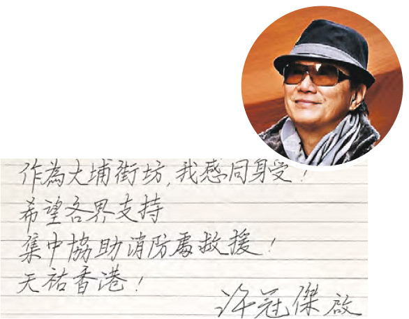 【明報專訊】不少演藝界人士非常關注大埔宏福苑火災,紛紛在社交網發文表示深切哀傷,並代轉發尋找失聯親人、拯救寵物和捐物品的社區支援資訊,又為消防員和醫護人員打氣。大埔居民「歌神」許冠傑在社交網公開親筆信,「作為大埔街坊,我感同身受!希望各界支持,集中協助消防處救援!天佑香港!」