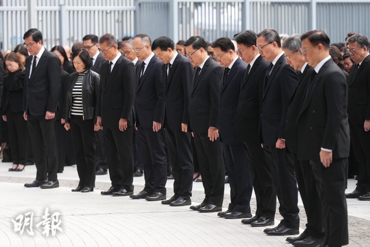 早上約7時半,參加默哀人士陸續到場,面向政府總部肅立。接近早上8時,排在前列的李家超與其他人士,包括農融、周霽、徐啟方、政務司長陳國基、財政司長陳茂波及律政司長林定國進場。