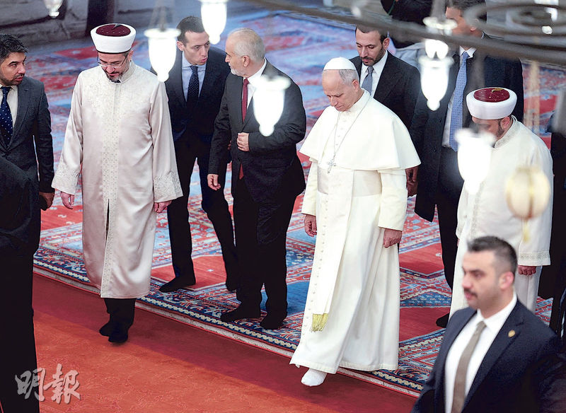 【明報專訊】教宗良十四世就任以來首次參觀清真寺,上周六(11月29日)造訪土耳其著名的17世紀建築傑作——藍色清真寺。其間教宗脫鞋以示尊重,但未有如原定計劃祈禱。
