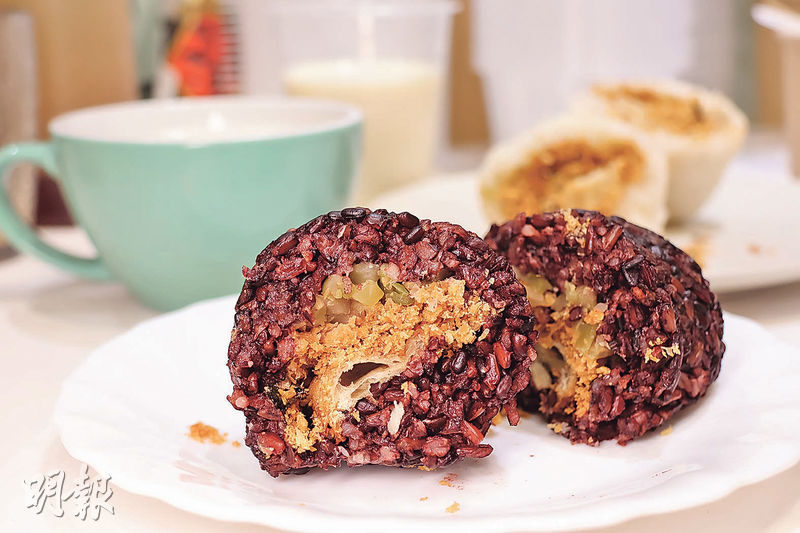 【明報專訊】素食者同樣能享受粢飯滋味,「珍心素食 豆漿•豆腐花專門店」推出的素粢飯一直為網民推介。珍心於2018年在旺角開業,2023年搬至上水只做外賣店,其手工豆品相當出色,招牌即撞豆腐花及即叫即做絹豆腐,香滑又富黃豆芳香。「因為豆漿與粢飯是孖寶組合,素粢飯更難找,因此推出素粢飯。」創辦人姚先生曾在上海豆漿店打工,懂得包粢飯,將紗巾放在掌心包粢飯,充滿古早風味。店家提供鹹甜口味,鹹味有素肉鬆、油條及榨菜,甜粢飯則有素肉鬆、油條及黃糖,糯米黏糯且粒粒分明。考量都市人較難消化糯米,店家亦提供三色糙米或藜麥白米,「它們黏性不及糯米,需用更多力壓實,才不會散開」。客人亦可自由選擇餡料。