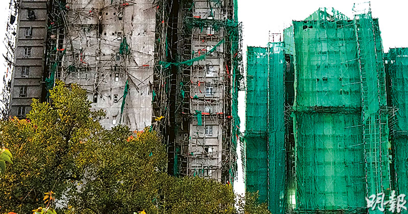 宏福苑有8廈,7幢焚毁,唯獨靠海的宏志閣倖免。了解屋苑維修進展的宏泰閣業主陳先生昨向本報表示,現時在宏志閣外牆棚架可見覆蓋混雜了深綠色的舊棚網,以及淺綠色的新裝棚網,其中新棚網屬颱風吹襲後補上(另文見A3)。
