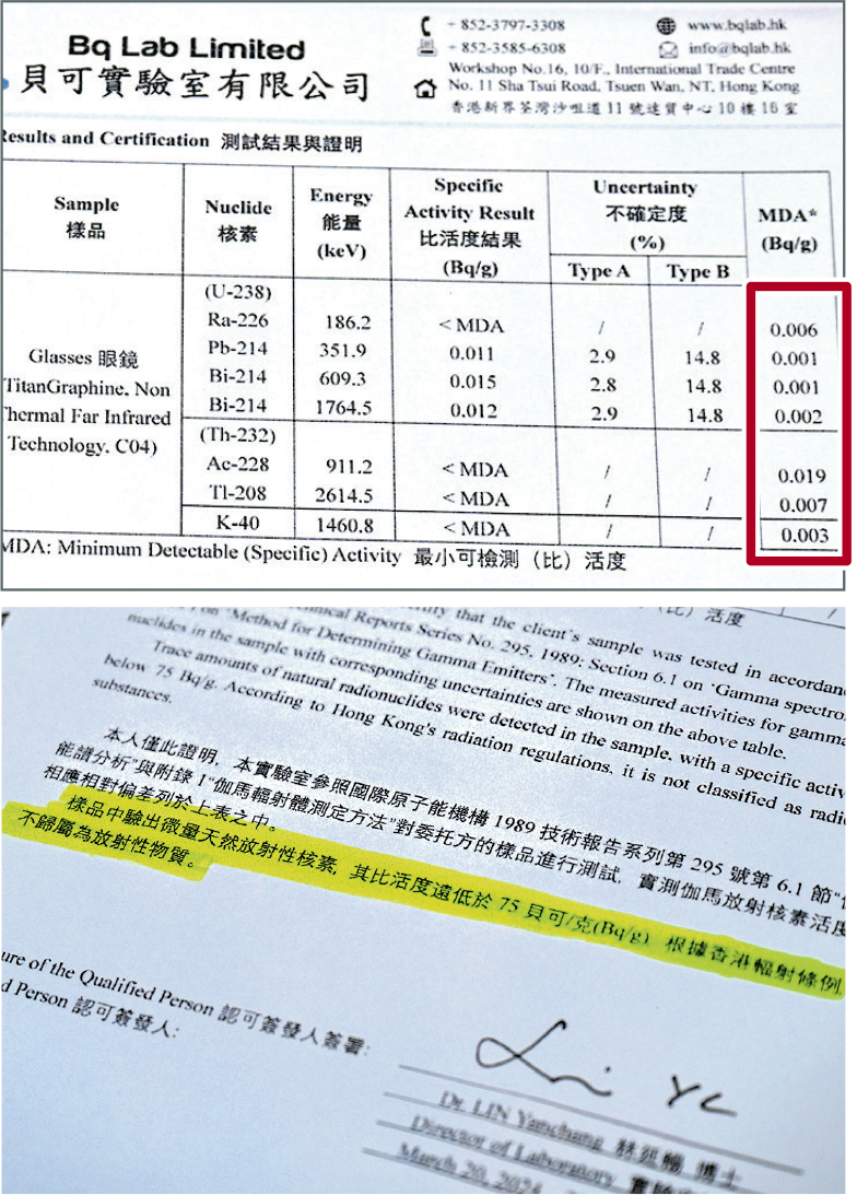 而恒楓眼鏡展示的檢測報告則顯示,其遠紅外線眼鏡框的電離輻射最小可檢測比活度(MDA)只介乎0.001至0.019Bq/g(圖上紅框),由於遠遠低於75Bq/g,根據香港的輻射條例,並不歸類為放射性物質(圖下)。