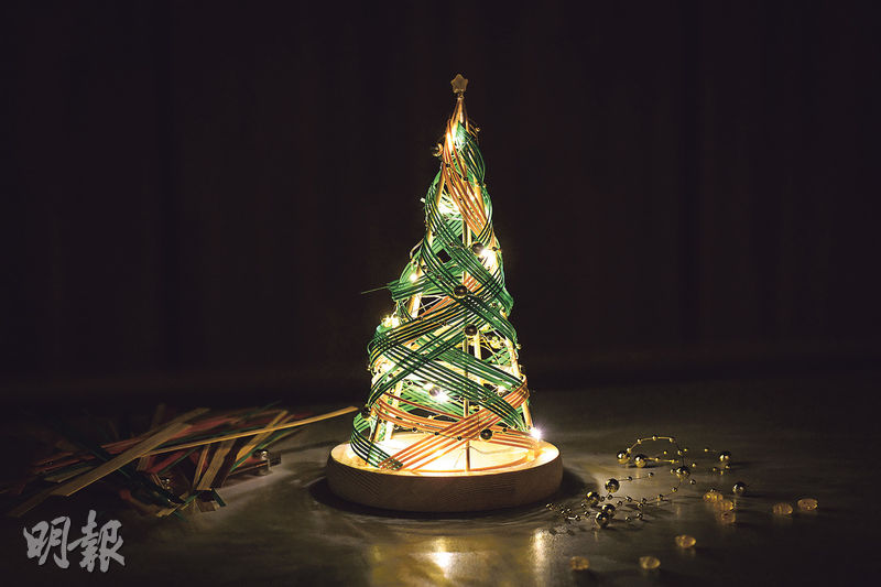 「若想為作品增添變化,可在旁點綴乾花或松果,增添聖誕氣氛。」竹篾以外,她認為掌握到作品的創作邏輯後,用紙藤、棉線,甚至紙條,只要是任何可隨意扭曲的物料,都可編織出這棵聖誕樹的外衣,留下縫隙,透出微光。