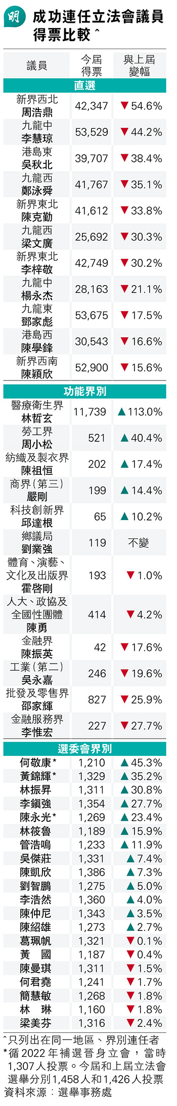 【明報專訊】新一屆90名立法會議員誕生,50人為現任議員,其中43人循同一選區或界別當選。本報整合43人今屆得票,對比上屆2021年選舉結果,全部11名地區直選連任議員得票均下跌,其中新界西北周浩鼎跌最多,其次是同為民建聯的九龍中李慧琼。20名在選委界別連任的議員,不計循補選晉身議會3人,10人得票有增長,票數增長最多是勞聯林振昇,增309票(增幅30.8%);跌票最多是經民聯梁美芬,少32票(跌幅2.4%),但得票率仍達90%。