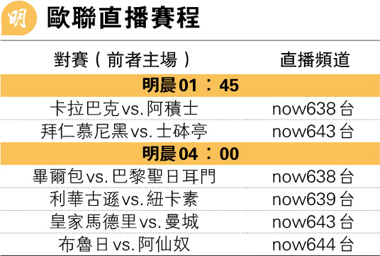 同日其餘賽事,榜首的英超勁旅阿仙奴將作客比利時球會布魯日,另一英超球隊紐卡素則征戰德甲的利華古遜。至於衛冕的法甲豪門巴黎聖日耳門將作客西甲的畢爾包;意甲勁旅拿玻里征戰葡超的賓菲加;意甲班霸祖雲達斯迎戰塞浦路斯球會帕福斯。
