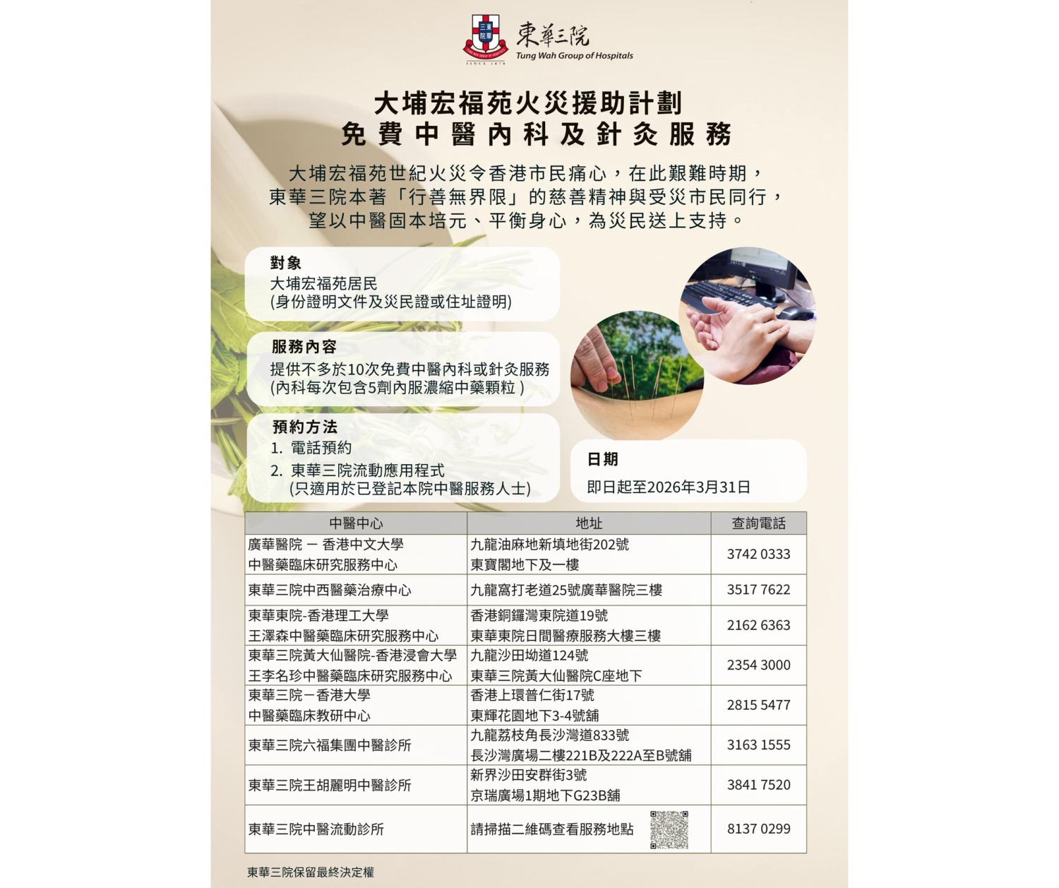 東華三院宣布,向大埔宏福苑居民提供免費中醫內科及針灸服務。東華三院稱,會從「大埔宏福苑事故愛心捐款」撥出約250萬元,由即日起至2026年3月31日期間,於東華三院轄下7間中醫診所及3間流動診所,為大埔宏福苑居民提供免費中醫內科及針灸服務,可透過電話或東華三院流動應用程式預約,並於登記時出示身分證明文件及災民證或住址證明,即可使用有關服務。