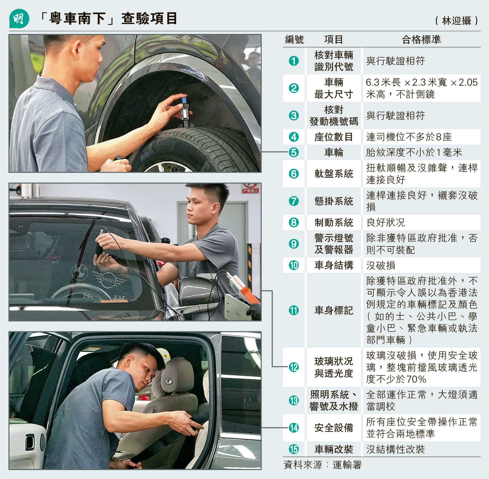 「粵車南下」車輛查驗中心車間經理鍾仲欣受訪稱,運輸署有為中心提供實務守則及培訓,並會每月對中心測評,查驗區域設有閉路電視,運輸署可抽查。鍾又提到,現時每輛車查驗大約需25分鐘,目前申請量不多,若日後有需要可調整增加人手,相信能夠應付。