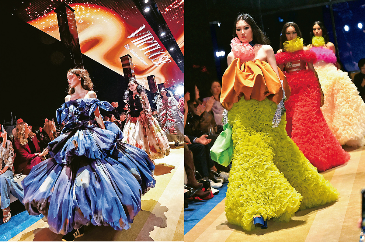 時裝騷選址中環4號碼頭,以香港引以為傲的維港為背景,高級訂製服在璀璨的天際景色下綻放光華,觀眾同時能感受城市的脈搏。當然時裝騷的焦點始終在於設計師及其作品,作為香港的代表胡穎琪,善於以情感和回憶投射設計,作品猶如跟觀者輕聲細語,讓人感到那種脆弱但綺麗的氛圍(A)。服裝注入很多感性細節如手工的蝴蝶結和花卉,服裝材質輕柔營造蓬鬆的廓形;模特兒妝容亦如出水芙蓉,令人我見猶憐。以誇張的荷葉邊薄紗層為簽名式設計的新進設計師小泉智貴,出道之初已經在世界時尚舞台一鳴驚人,數年後的今天,設計功力有增無減,漸見大師風範。今次時裝騷作品的荷葉邊薄紗層比之前略為縮小,但結合上身刺繡精緻的胸甲或雲朵形上身,形成對比強烈的輪廓(B)。此外,小泉智貴的用色一向大膽,今次的鮮橙配芥末黃、少女淺藍配酒紅、寶藍配淺紫,加上頸飾的熒光黃或血紅、草綠手袋的點綴,感覺就像一道道精緻甜品,令人心花怒放、垂涎欲滴。