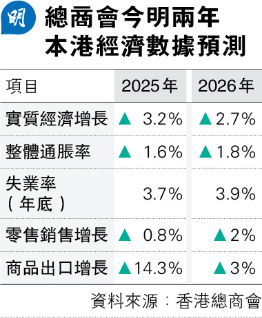 【明報專訊】根據香港總商會經濟預測,明年香港實質經濟(real GDP)增長將由今年3.2%增幅放緩至2.7%(見表),明年整體通脹率則略增至1.8%,失業率亦上升至3.9%。總商會經濟師馮凱盈表示,企業加快人工智能(AI)應用或令失業率短期內推高,尤其是初級職位,料失業率在更長時間維持近4%的水平。