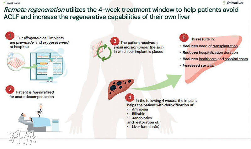 Stimuliver首席商務官Giles Dudley表示,該公司研究方案是先將誘導性「萬能幹細胞」(iPS cells)轉變成肝細胞和血管的「內皮細胞」(即是血管內壁的細胞),然後讓這兩種細胞組成一個立體的「臨時肝臟」,再植入肝病患者皮下。