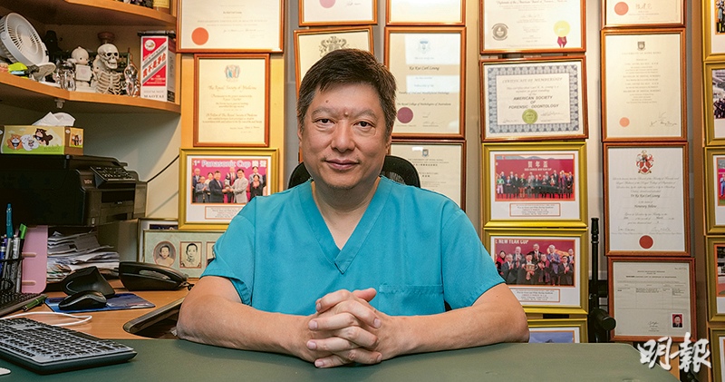 【明報專訊】走進梁家駒醫生的診療室,冷色調的白光明亮,整潔、乾淨,牙科櫈擺在正中,正像刻板印象中牙科診所的樣子。再走近些,只見一顆帶螺絲的植牙模型擺在窗邊,兩邊各有一隻塑膠狗狗玩偶「守衛」,再旁邊是一幅色彩鮮艷充滿童稚氣的畫,對面的牆上則掛着一張合影,相中穿傳統唐裝的男人們在禮堂前一字排開。與診療室連通的辦公室,則更可見其個人特色。暖黃色的光柔和映着一整牆挨挨擠擠的證書、嘉許狀,與知名人物的合照,唯有左下角最靠近手邊的位置,是帶有古舊痕迹的家族長輩照片。冷暖、繁簡、科學與溫情,一組組看得到的對照穩穩落在梁家駒醫生身上,顯現着他豐富的專業經驗與生命經歷。他被稱為「首位華人齒科法醫」,參與諸多重大案件及事故的工作,卻也在系列劇集演足4輯法醫。他自認更多時候是執業牙醫,也是傳統壽衣行傳人,又寫過專欄信箱回答性學話題,繁雜的經驗,由「幫人」的念頭聯通。