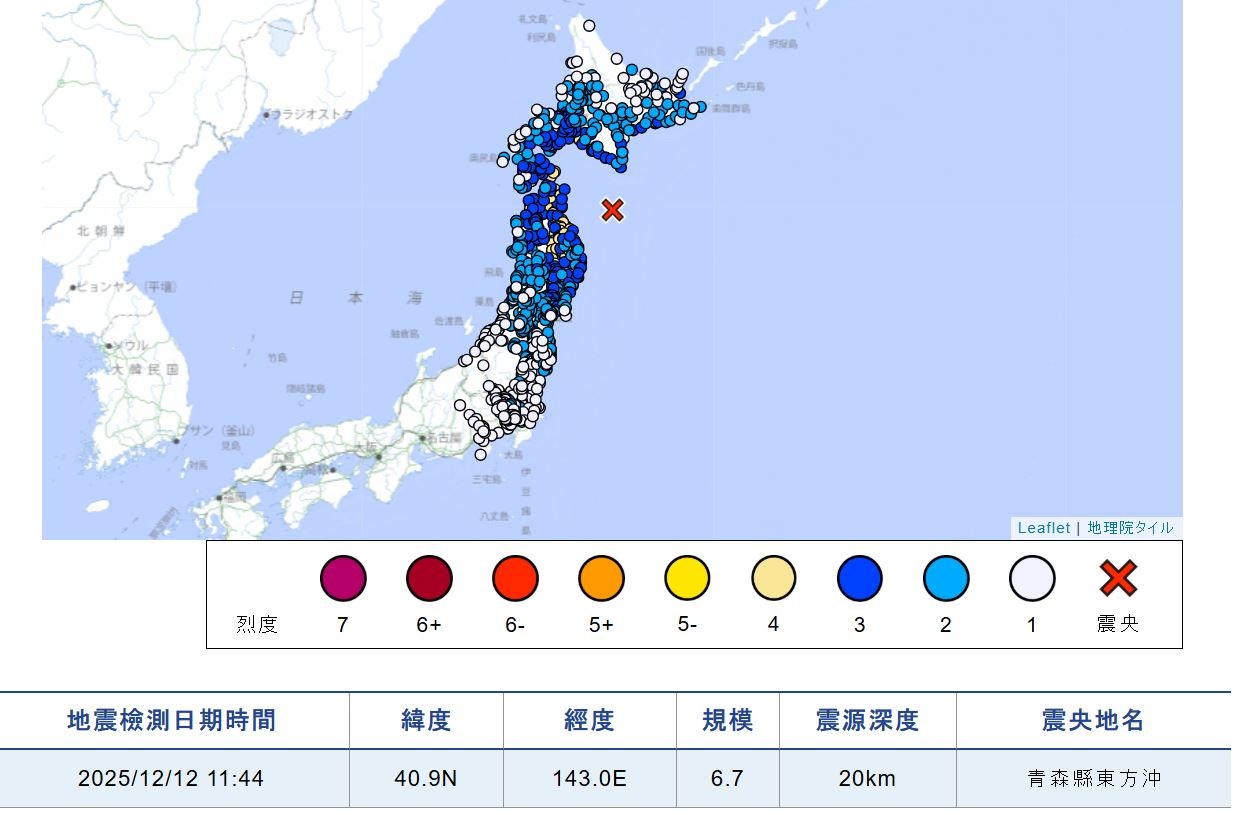 即時國際 日本青森縣以東海域發生6.7級地震 當局發布海嘯預警 (11:01) 發佈於 7 天 前 2025 年 12 月 12 日 By 明報 日本青森縣以東海域在當地時間今日(12日)早上11時44分(香港時間今早10時44分)發生6.7級地震,震源深度約20公里。青森縣八戶市、北海道函館市及岩手縣盛岡市等地有震感。 日本氣象廳對青森縣、岩手縣、宮城縣及北海道太平洋沿岸中部發布海嘯預警,預計會有約1米高海浪,相信不會造成破壞。(NHK/路透社) 相關文章:地震日本編輯推介青森縣 Up Next 泰王准阿努廷申請 解散下議院以舉行大選 (09:18) 不要錯過 美扣油輪將充公船上原油 特朗普:將陸路阻截打擊毒品由委內瑞拉輸美 (12:06) 繼續閱讀 贊助商 猜你喜歡 Trip.com年度報告:港人平均外遊飛3次 日上月內地旅客增3% 近4年最低 按月大跌21% 同期港訪日旅客量跌逾8% 沖繩北大東島設雷達部隊 監視華艦軍機太平洋動向 日本最後兩頭大熊貓下月歸還中國 (16:47) 熊襲頻傳 「熊」當選日本年度漢字 日青森縣6.9級地震 一度發海嘯注意報