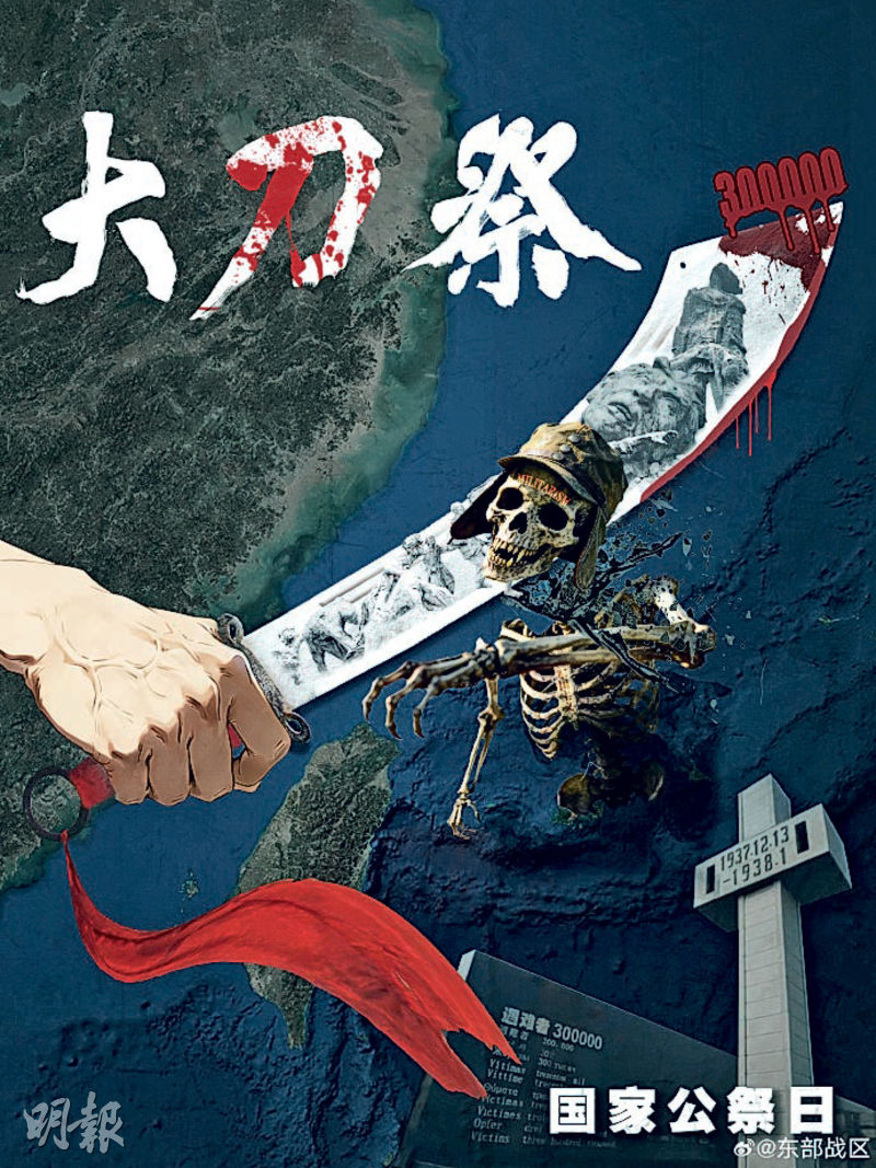 【明報專訊】解放軍各部隊昨日通過瞻仰烈士陵園、參觀紀念館等多種活動,參與南京大屠殺國家公祭日紀念。作戰任務主要面向日台的解放軍東部戰區,昨發布國家公祭日主題海報《大刀·祭》,並配文「高舉血祭大刀」、「堅決斬斷骯臟頭顱」。