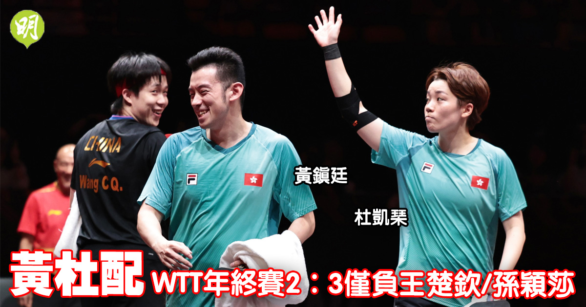 首闖WTT年終賽的港隊混雙組合黃鎮廷/杜凱琹,昨於A組次輪以局數3:2勇挫印度隊的文路殊沙亞/姬蒂爾,收穫小組賽首勝,今晚在末輪硬撼世界排名第3的國手王楚欽/孫穎莎,後者小組此前兩戰全勝。