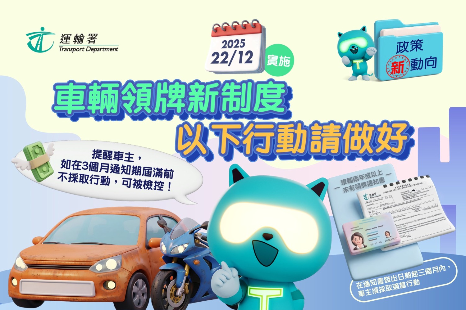 車輛登記及領牌新制度將於12月22日實施,運輸署當日起會向兩年或以上未領牌車輛的登記車主發通知書,車主須在發出通知書日期3個月內為車輛領牌;或將車輛拆毀或永久送離香港後,提交證明文件至運輸署以及取消登記。運輸署表示,新制度旨在加強規管長期未領牌的車輛,從源頭解決不當棄置車輛的問題,新制度下,未領牌車輛將一直登記在車主名下,車主須為其車輛負上責任。