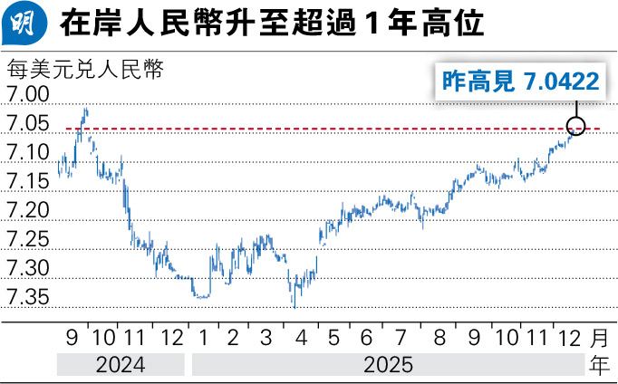 【明報專訊】港股A股連日下跌,另邊廂人民幣匯率持續走強,昨日續創去年9月底以來高位。11月美國非農就業數據公布前,美元走弱,推動在岸人民幣上升,昨高開60點子(1元等於10,000點子)後,全日保持在7.042附近波動,截至昨晚8時報7.0422,上升50點子,離岸人民幣報7.0365,上升68點子。美匯指數報98.12,下跌0.17%,見兩月低位。港匯亦向好,昨高見7.776。