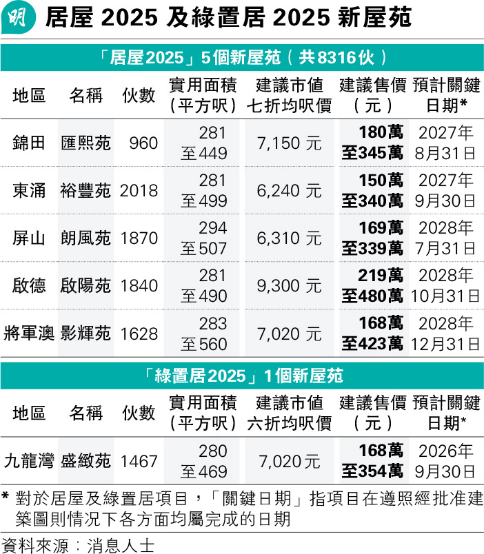 新一期居屋將於明年第二季推售,涉及5個新屋苑共8316伙,分別是錦田匯熙苑、東涌裕豐苑、屏山朗風苑、將軍澳影輝苑及啟德啟陽苑,平均呎價6240至9300元;除啟陽苑外,其餘4個新屋苑均位於新界(見表)。消息稱,啟陽苑單位面積介乎281至490平方呎,其中較大面積單位(464至490平方呎)約有360個,佔屋苑總數約20%;而全屋苑單位售價介乎219萬至480萬元,相信會是熱門選擇。