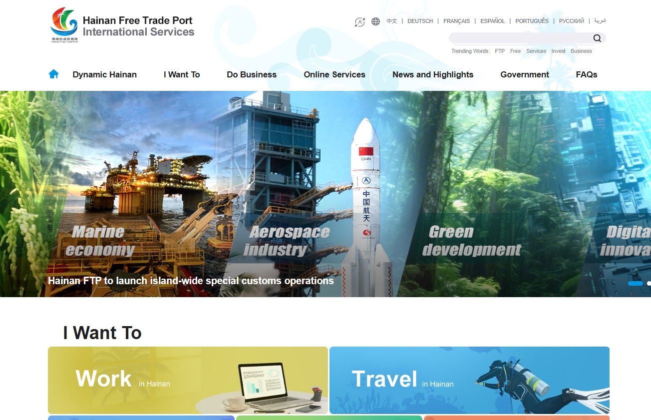 海南自由貿易港國際服務門戶(en.hainan.gov.cn)為多語種網站,聚焦外資、外企、外國人的需求,整合集成全省29個涉外業務系統和網站,設置在瓊營商、在線服務、資訊看點等7大一級欄目,下設29個二級欄目及若干三級欄目。