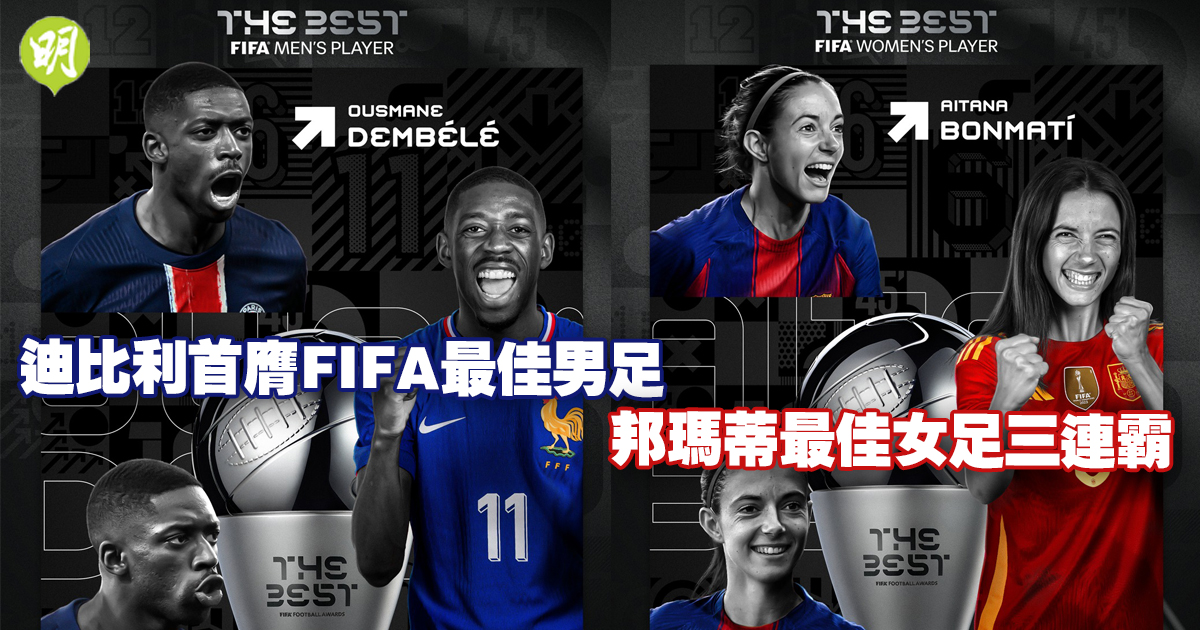 國際足協(FIFA)今晨(17日)在卡塔爾多哈舉行年度頒獎禮,結果效力法甲勁旅巴黎聖日耳門(PSG)的法國國腳前鋒奧士文尼迪比利首度獲膺最佳男足球員獎項,繼早前金球獎後再獲年度大獎。至於效力巴塞隆拿女足的西班牙國腳艾坦娜邦瑪蒂則連續3屆獲選為年度最佳女足球員。