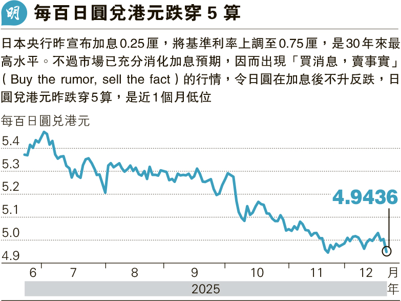 【明報專訊】日本央行委員昨一致議決加息0.25厘,將基準利率上調至0.75厘,時隔11個月再次加息,將利率提升至30年來最高水平。由於該央行行長植田和男本月早前已明確暗示將會加息,今次利率決定不令市場意外。日本央行昨預告,若條件允許,未來將繼續加息。不過由於市場已充分消化加息預期,以致加息後出現「買消息,賣事實」(Buy the rumor, sell the fact)的行情。日圓在加息後不升反跌,兌美元跌至157水平;每百日圓兌港元跌穿5算,是近1個月低位。