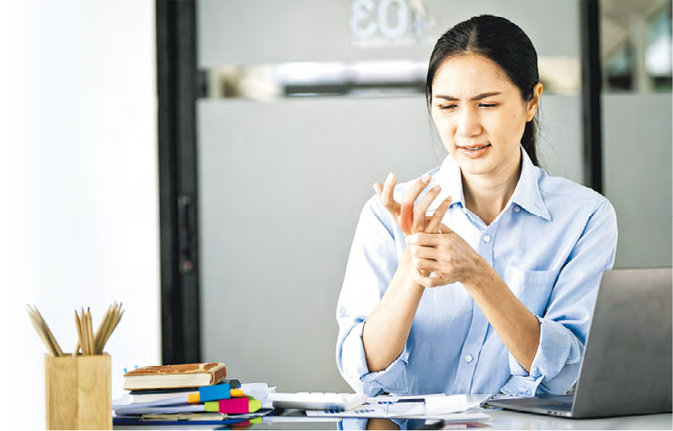 工作以外的時間,持之以恆地養成運動習慣與手部護理也甚為重要。除非患處有明顯急性發炎,即紅腫、疼痛、發熱等情况,否則可在僵硬繃緊的地方,以暖水袋或電熱墊敷約20分鐘,放鬆緊張的肌肉。其次,每天做15至30分鐘中等強度的帶氧運動,例如快步行、原地抬腿、踏健身單車和游泳等,均有助改善血管健康及新陳代謝,加快身體修復速度。
