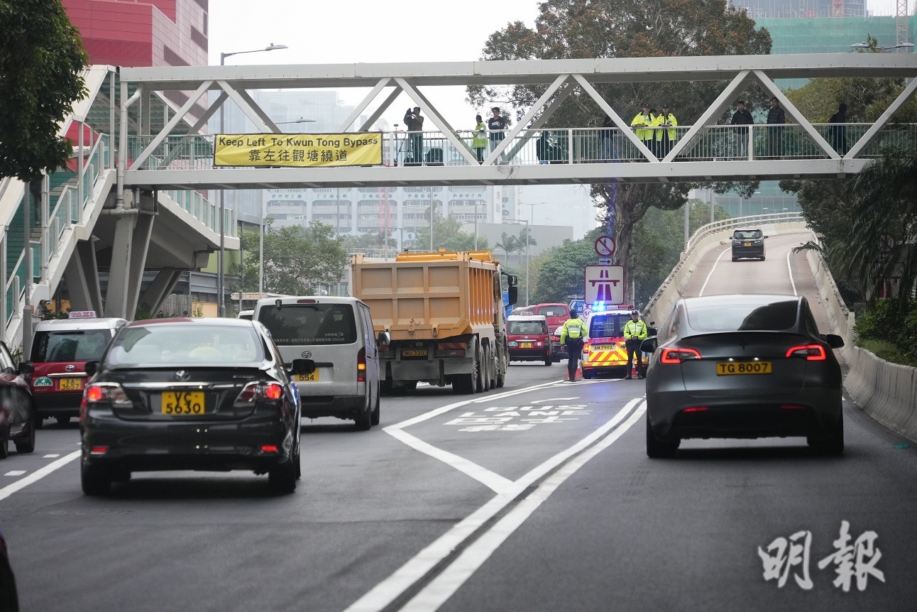 中九龍繞道(油麻地段)通車後,由「舊路」啟德隧道駛出的車輛沿啟福道前行不能再靠右直上觀塘繞道,需靠左並左轉繞入常怡道及宏照道、即Megabox一帶才能再上觀塘繞道。昨日不少啟德隧道駛出的車輛違規切線照上「觀繞」。記者今早在該路口觀察,發現有多名警員駐守,有警車直接停泊在上觀塘繞道前的影線內。警力明顯增加下,今早未再見有啟德隧道駛出的車輛違規切線上繞道。
