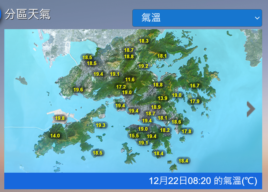 即時熱點 天氣|天文台:日間部分時間有陽光 最高22°C (08:32) 發佈於 3 個月 前 2025 年 12 月 22 日 By 明報 早上8時10分,天文台錄得氣溫19.3°C,相對濕度78%。 一股清勁至強風程度的東北季候風正影響廣東沿岸。此外,一道雲帶正覆蓋南海北部。今早(22日)本港多處地區氣溫較昨日(21日)低一兩度。 本港地區今日大致多雲。日間部分時間有陽光,最高氣溫約22°C。吹和緩至清勁東至東北風,離岸及高地間中吹強風。 展望明日初時風勢較大。周三(24日)日間溫暖。聖誕節假期早晚清涼。隨後一兩日大致天晴及乾燥,日夜溫差較大。(天文台) 相關文章:天文台天氣天氣速遞 Up Next 短片:危地馬拉消防員化身聖誕老人 大橋游繩70米派禮物 (17:16) 不要錯過 天氣|平安夜料溫暖 聖誕節市區氣溫最低15°C Boxing Day 14°C (20:15) 繼續閱讀 贊助商 猜你喜歡 天氣|天文台:周日早上市區最低14℃ 部分地區寒冷 (17:55) 天氣|天文台:多雲有幾陣雨 今晚轉涼降至約17℃ (09:25) 【Emily】天文台「矚目天氣及氣候事件選舉」 投票有機會獲紀念品 天氣|天文台:周六多雲有雨 晚上轉涼氣溫17至21°C 下周日跌至最低14°C (21:22) 天氣|天文台:短暫時間有陽光 最高19°C (08:24) 天氣|天文台:周四多雲早晚有微雨 氣溫介乎17至20°C (20:57)
