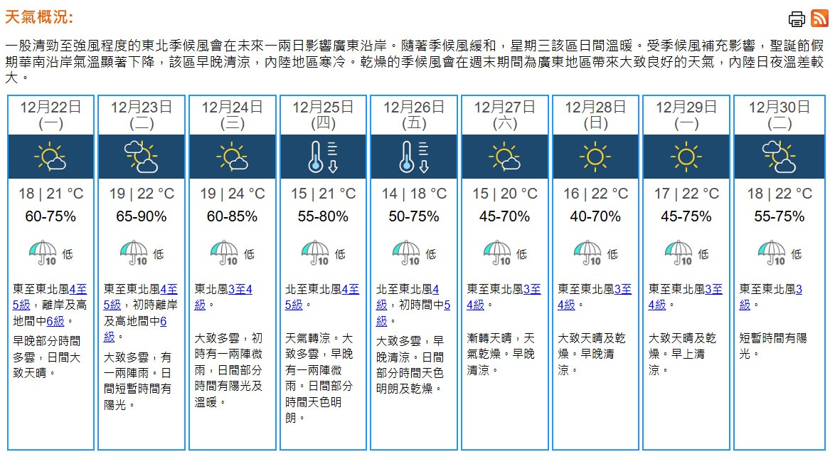 即時熱點 天氣|平安夜料溫暖 聖誕節市區氣溫最低15°C Boxing Day 14°C (20:15) 發佈於 2 天 前 2025 年 12 月 21 日 By 明報 本港地區明日(22日,周一)天氣預測:早晚部分時間多雲。明早稍涼,市區最低氣溫約18°C,新界再低一兩度。日間大致天晴,最高氣溫約21°C。吹和緩至清勁東至東北風,離岸及高地間中吹強風。展望周二(23日)初時風勢較大。周三(24日,平安夜)日間溫暖。九日天氣預報顯示,聖誕節(25日)市區氣溫估計最低15°C,拆禮物日(26日,Boxing Day)最低14°C。(天文台) 相關文章:天文台天氣天氣速遞編輯推介 Up Next 天氣|天文台:日間部分時間有陽光 最高22°C (08:32) 不要錯過 本地馬友變身地中海名菜 (09:00) 繼續閱讀 贊助商 猜你喜歡 天氣|天文台:日間部分時間有陽光 最高22°C (08:32) 天氣|今日天晴乾燥 市區最高氣溫料25°C 聖誕節料早晚清涼 (09:12) 天氣|天文台:日間乾燥及溫暖 最高25°C (09:46) 天氣|天文台:日間部分時間有陽光 最高23°C (08:46) 天氣|天文台:日間乾燥 晚上漸轉多雲 (08:20) 天氣|天文台:日間乾燥溫暖 最高25°C (08:14)