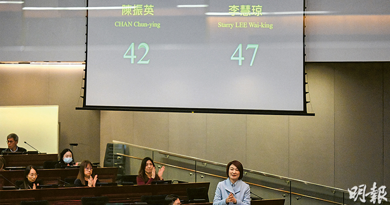 【明報專訊】立法會議員昨選出新任立法會主席,民建聯李慧琼以47票對42票擊敗「G19」金融界陳振英。她當選後宣布,下周三(14日)即召開本屆首次立法會大會,議程未定但會聚焦大埔火災。本報昨向政務司長辦公室查詢下周三會上會否交代宏福苑重置方案、修例建議,政府發言人引述特首早前發言稱,政府將於新一屆立法會首次會議提出政府議案,與立法會商討如何支援災民和重建復常,並與立法會合作透過制定和修訂法律改革現有制度。