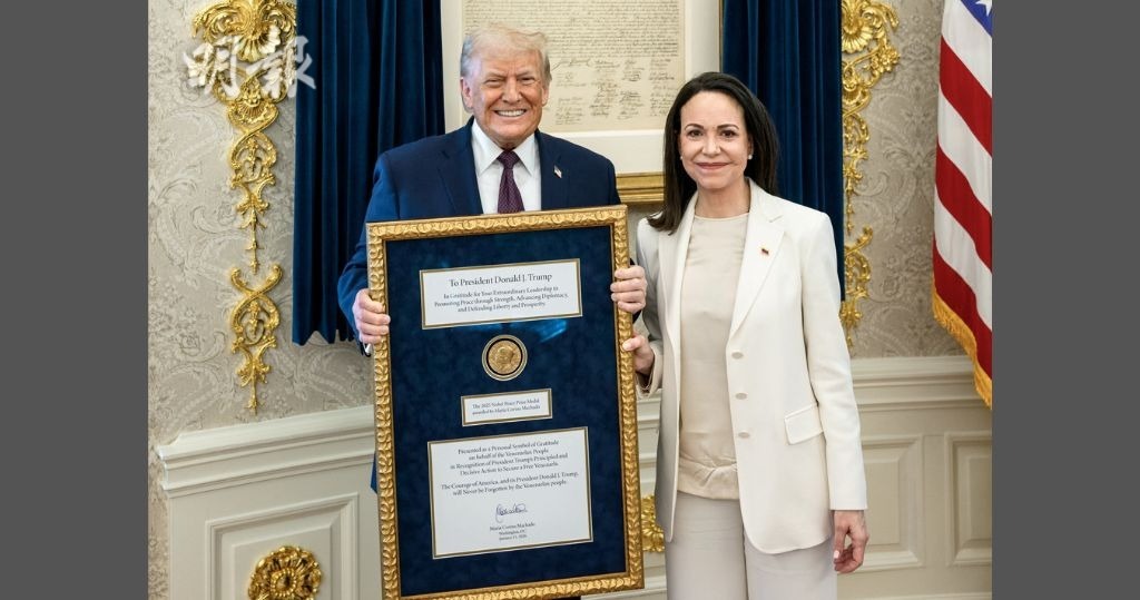 即時國際 馬查多贈諾貝爾和平獎獎章予特朗普 特朗普接受獎章 (11:46) 發佈於 2 個月 前 2026 年 1 月 16 日 By 明報 委內瑞拉反對派領袖馬查多周四(16日)到訪白宮,與美國總統特朗普會面,馬查多並向特朗普送上自己所得的諾貝爾和平獎獎章。白宮官員表示,特朗普會保留該獎章,但諾貝爾和平獎委員會稱獎項不能改變、分享或轉贈,而獎章可以由其他人持有,但和平獎得主不會改變。 特朗普在社交平台Truth Social發文稱,「很榮幸與馬查多會面,她送上她的和平獎獎章,表揚我的工作,這是美好的互相尊重舉動」。白宮方面稱,馬查多已把和平獎獎章留在白宮。(CNN) 相關文章:委內瑞拉特朗普編輯推介美國諾貝爾和平獎馬查多 Up Next 東京JR山手線及京濱東北線因停電全線停駛 下午1時恢復營運 (09:42) 不要錯過 尹錫悅涉妨礙執行公務等罪被判監5年 (14:08) 繼續閱讀 贊助商 猜你喜歡 華盛頓首辦關鍵礦物會議 擬建戰略聯盟 特稱與古巴領導層談判 有望達協議 未遮部分姓名裸體 司法部被轟二次傷害 特嫌「太覺醒」 文化殿堂大翻新 美伊釋談判信號 未棄動武選項 哈梅內伊警告開戰將波及整地區 美抵制加劇財困 聯國恐7月「無錢用」 難解結構性財務風險 古特雷斯促成員國交會費