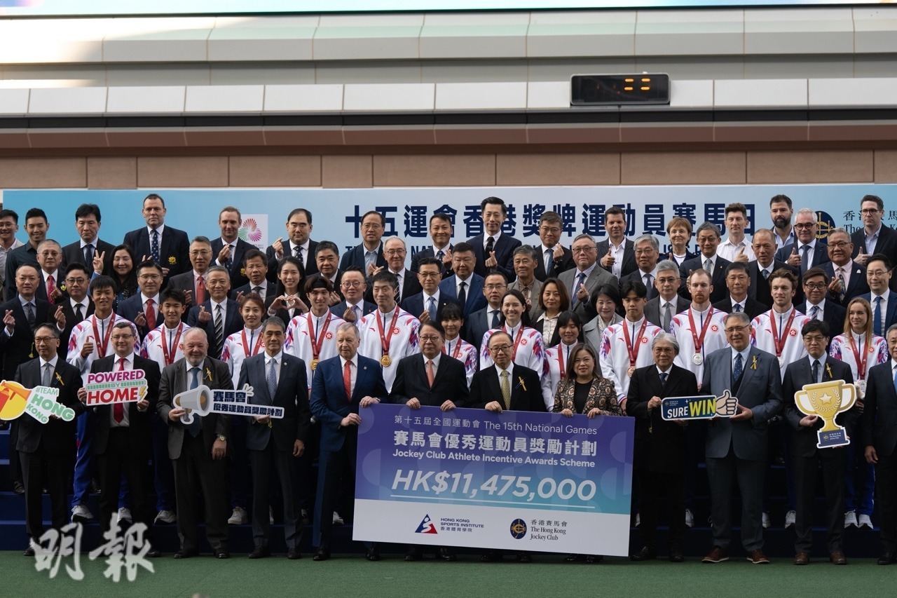 「十五運會香港獎牌運動員賽馬日」今日(18日)於沙田馬場舉行,表揚港隊在第十五屆全國運動會中,奪得9金、2銀及8銅。賽馬日同場進行「賽馬會優秀運動員獎勵計劃」支票頒贈儀式,向獎牌健兒發放獎金逾1100萬元。