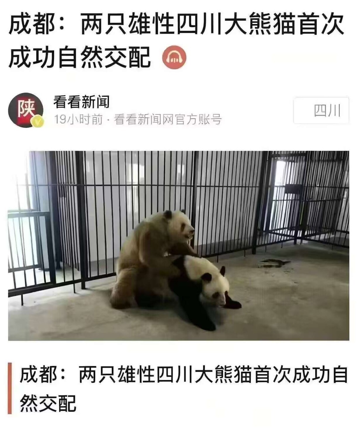 四川省成都市成華公安局今(18日)發布警情通報,兩名網民利用技術手段偽造題為「成都:兩隻雄性四川大熊貓首次成功自然交配」的虛假新聞報道截圖,配以誤導性文字在網上發布傳播,引發大量不實解讀,擾亂網絡秩序,造成不良社會影響。警方接到民眾報案後,經調查取證,已依法對董、高二人予以行政拘留,並依法關停其相關網絡帳號。