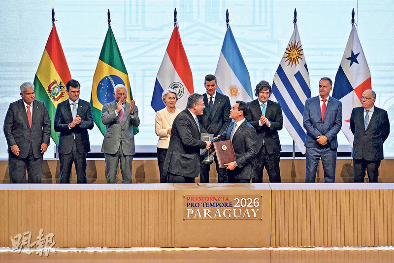【明報專訊】歐盟與南美洲南方共同市場(Mercosur,簡稱南共市)上周六(17日)在巴拉圭首都亞松森簽署自由貿易協定,標誌雙方歷經25年談判後,達成歐盟有史以來規模最大的貿易協議。協議正值美國特朗普政府廣泛動用關稅及貿易威脅,各國紛紛尋求新伙伴關係之際,歐盟委員會主席馮德萊恩在簽署儀式上表示,歐盟選擇「公平貿易而非關稅」,強調在全球關稅威脅、不確定性及保護主義抬頭之際,協議釋出強烈信息。