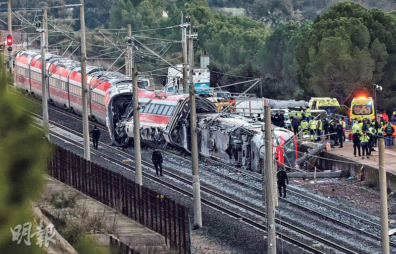 【明報專訊】西班牙南部周日(18日)發生該國13年來最嚴重鐵路意外,一列高速列車行駛期間出軌並與另一列車相撞,造成最少39死122人傷,其中12人接受深切治療。運輸部長普恩特表示,現場路段是直路,而且路軌去年才更換,列車出軌並不尋常。西班牙首相昨宣布全國哀悼3天。
