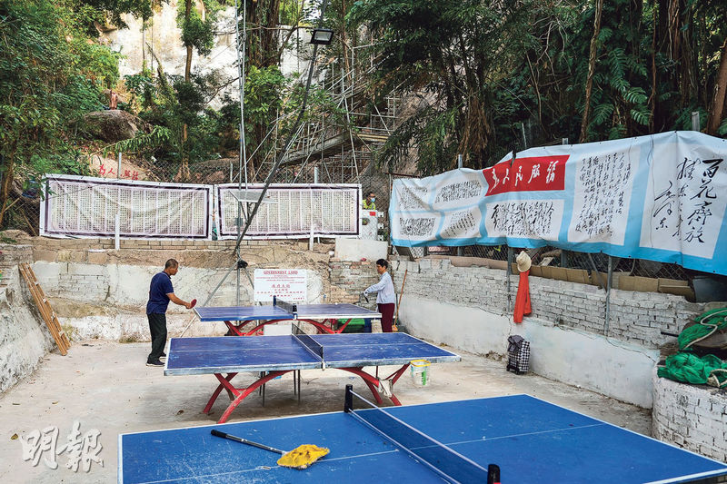 本報記者上周到主教山觀察,發現整個山頭均有懷疑非法構築物(見圖),包括至少19張乒乓球枱、健身架等康體設施及多個神壇,大部分設施分別位於近巴域街山邊、配水庫附近,以及近棠蔭街的山邊,而備受爭議的「毛澤東文化館」則在棠蔭街山邊休憩處附近,現場一處官地上放有5張乒乓球枱和康體設施,後方山坡一塊石上有一尊毛澤東像,附近豎立一塊木牌寫上「香港毛澤東文化館」,毗鄰有一個以膠板和木搭建而成的空間,內有椅子和掛畫等。