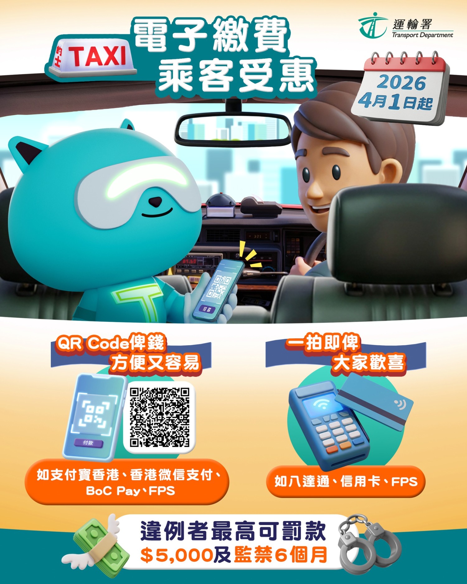 即時熱點 的士4月1日起須提供電子支付 違者最高罰5000元、監禁半年 (16:29) 發佈於 3 天 前 2026 年 1 月 28 日 By 明報 運輸署周三(28日)表示,由4月1日起,所有的士司機必須提供至少一種二維碼和一種非二維碼電子支付方式,讓乘客支付車費。違者最可高罰5000元及監禁6個月。 資料來源:運輸署Agent T facebook 相關文章:熱門HOTPICK的士編輯推介運輸署電子支付 Up Next 天氣|天文台:今早多區氣溫較昨日低1至2°C 日間最高21°C (08:24) 不要錯過 天氣|天文台:周四多雲早晚有微雨 氣溫介乎17至20°C (20:57) 繼續閱讀 贊助商 猜你喜歡 安全帶解不開困客45分鐘 揭鎖扣被塞錫紙 城巴報警 櫻花|短片:沙田安景街櫻花盛放【多圖】 (14:42) 陳美寶:爭取盡快推出全面網上預約免試簽發櫃位服務 (13:26) 短片:最後兩隻旅日大熊貓回國 民眾揮淚告別「心失去了一部分」 (17:21) 短片:馬鞍山櫻花開 市民忙打卡 (14:14) AirTag 2|蘋果推新一代AirTag 揚聲器音量、精準尋找範圍增50% (13:56)