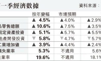 【明報專訊】中國內地首季經濟增長好過市場預期,不過次...