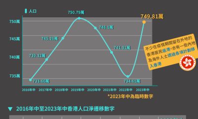 政府統計處公布,2023年年中香港人口臨時數字為約7...