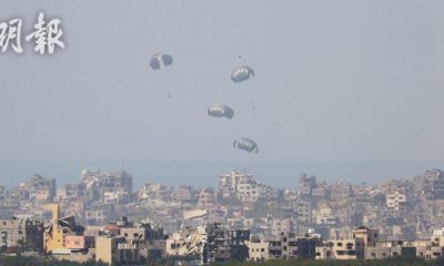 加沙地帶北部加沙市周五(8日)的一次空投人道物資行動...
