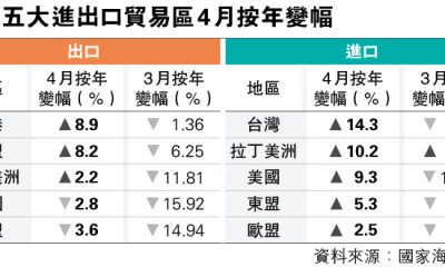 【明報專訊】中國海關總署公布4月進出口數據,以美元計...
