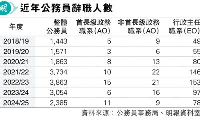 【明報專訊】公務員離職數字回落,惟首長級政務官(AO...