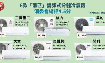 消委會測試12款「兩匹」變頻式分體冷氣機,5款為冷暖...